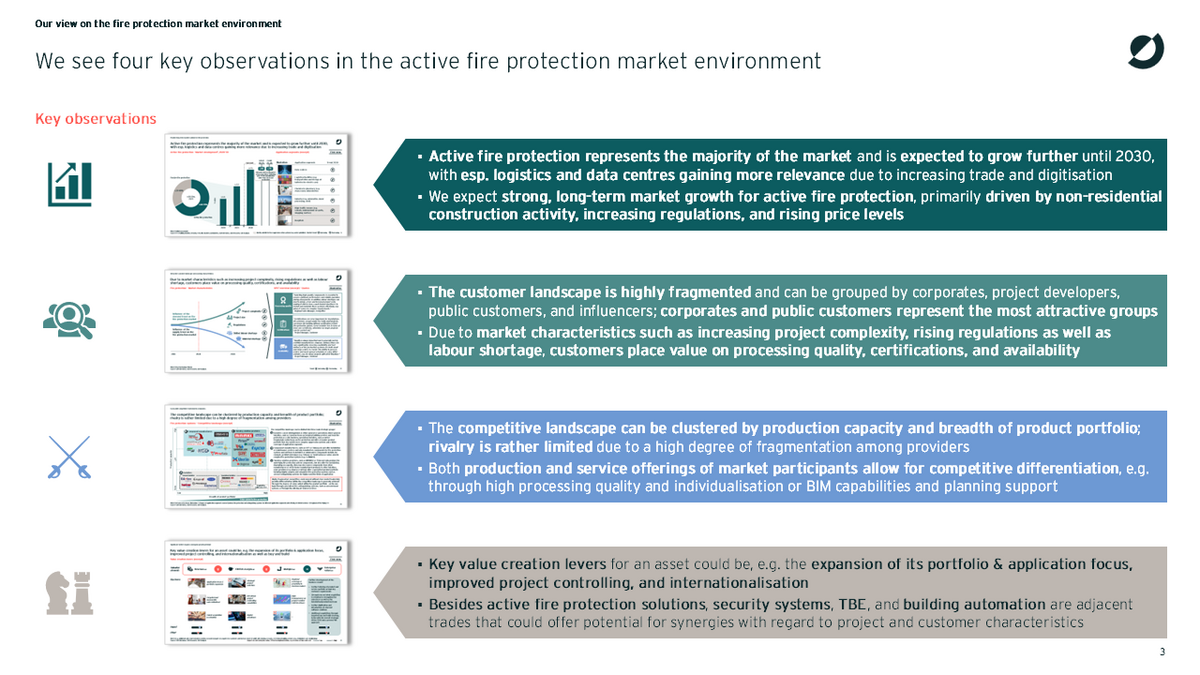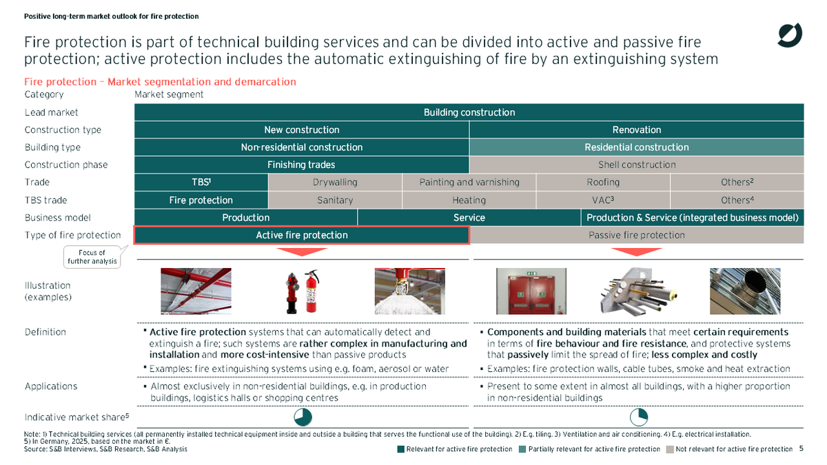 In dieser Studie wird der Markt für aktive Brandbekämpfungssysteme untersucht, der bis 2030 weiter wächst, besonders durch den Ausbau von Logistik und Rechenzentren. Der Markt wird vor allem durch den nicht-wohnwirtschaftlichen Bau, strengere Vorschriften und steigende Preise angetrieben. Trotz einer fragmentierten Wettbewerbslandschaft können sich Anbieter durch hochwertige Verarbeitung, BIM-Fähigkeiten und individuelle Lösungen differenzieren. Besonders gefragt sind Unternehmen und öffentliche Auftraggeber, die auf Qualität, Zertifikate und Verfügbarkeit achten. Zusätzlich werden Potenziale für Wertschöpfung und Synergien mit benachbarten Bereichen wie Sicherheitssystemen und Gebäudeautomation aufgezeigt.