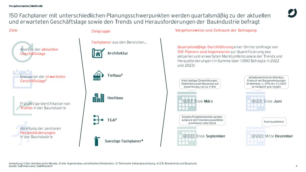 Um ein differenzierteres Bild über die konjunkturelle Entwicklung der Baubranche in Deutschland zu erhalten, führt S&B Strategy seit QI/2022 eine quartalsmäßige Planerbefragung mit 150 Architekten, Planern und Bauingenieuren aus unterschiedlichen Segmenten durch. Dies dient als Frühindikator für die Entwicklungen im Bausegment und ermöglicht es, relevante Trends, wie z.B. Digitalisierung und energetische Anforderungen, sowie Herausforderungen, wie z.B. Fachkräftemangel und steigende Projektkomplexität, frühzeitig zu erkennen und zu bewerten. Die hieraus folgenden Themen verdeutlichen die Herausforderungen, welche die Baubranche in den kommenden Jahren verstärkt betreffen werden.